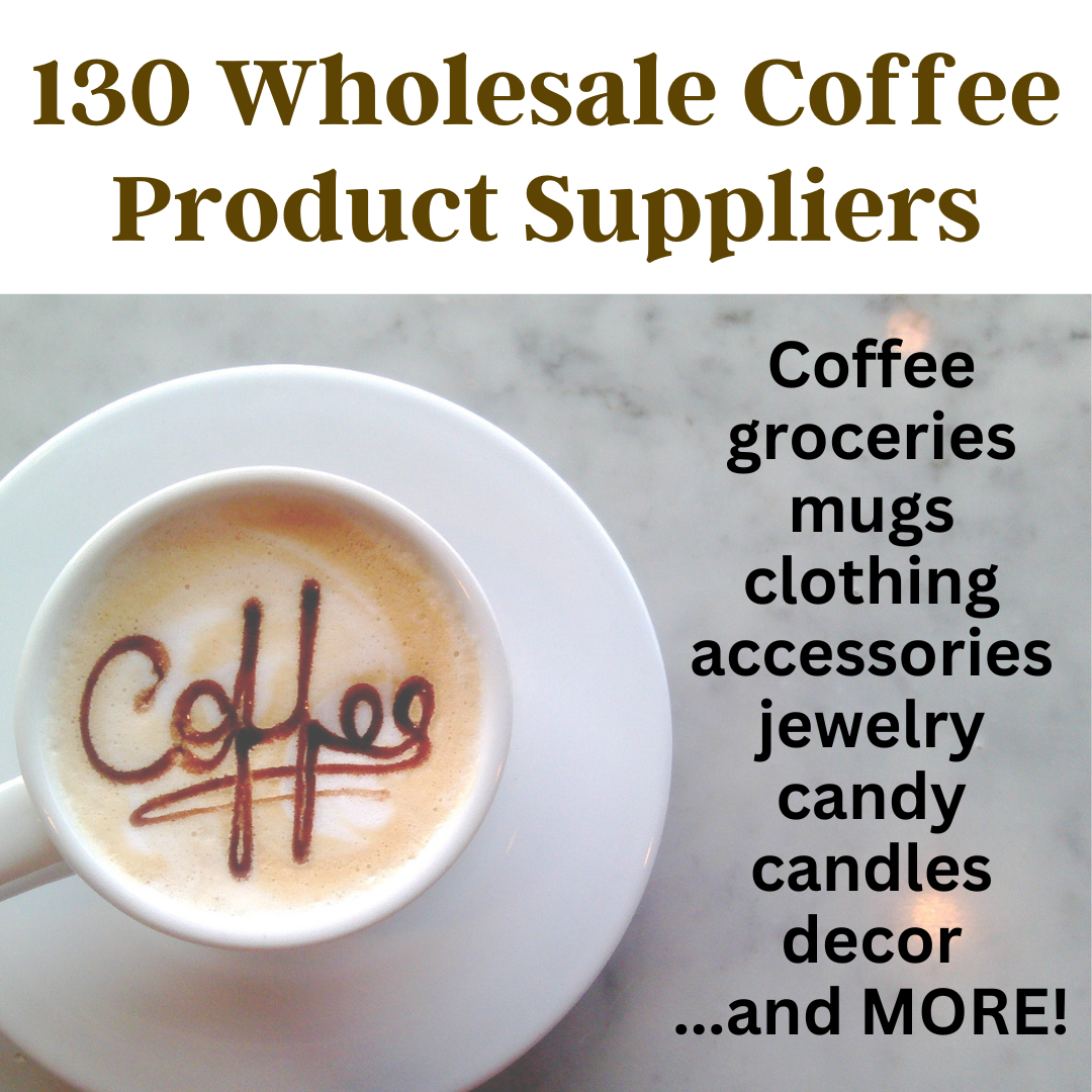 This directory provides contact information for 130 wholesale suppliers of coffee and coffee-related products including mugs, coffee makers, grinders, mugs, candy, candles, mugs, socks, tshirts, jewelry, and more!